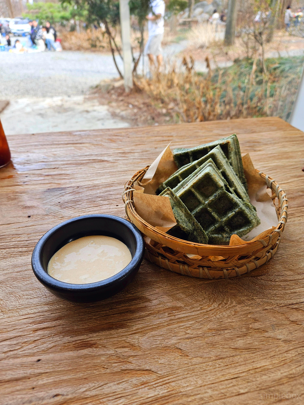 다음으로 콩크림 눌림 쑥떡을 먹었을 때 식감에 놀랬어요. '와플처럼 생긴 게 쑥떡 맛이 나봐야 얼마나 나겠어?' 생각했었는데, 진짜 쫀득쫀득한 쑥떡의 맛이었어요. 간은 거의 없이 쑥떡맛이다 보니 부담 없이 먹을 수 있었어요.