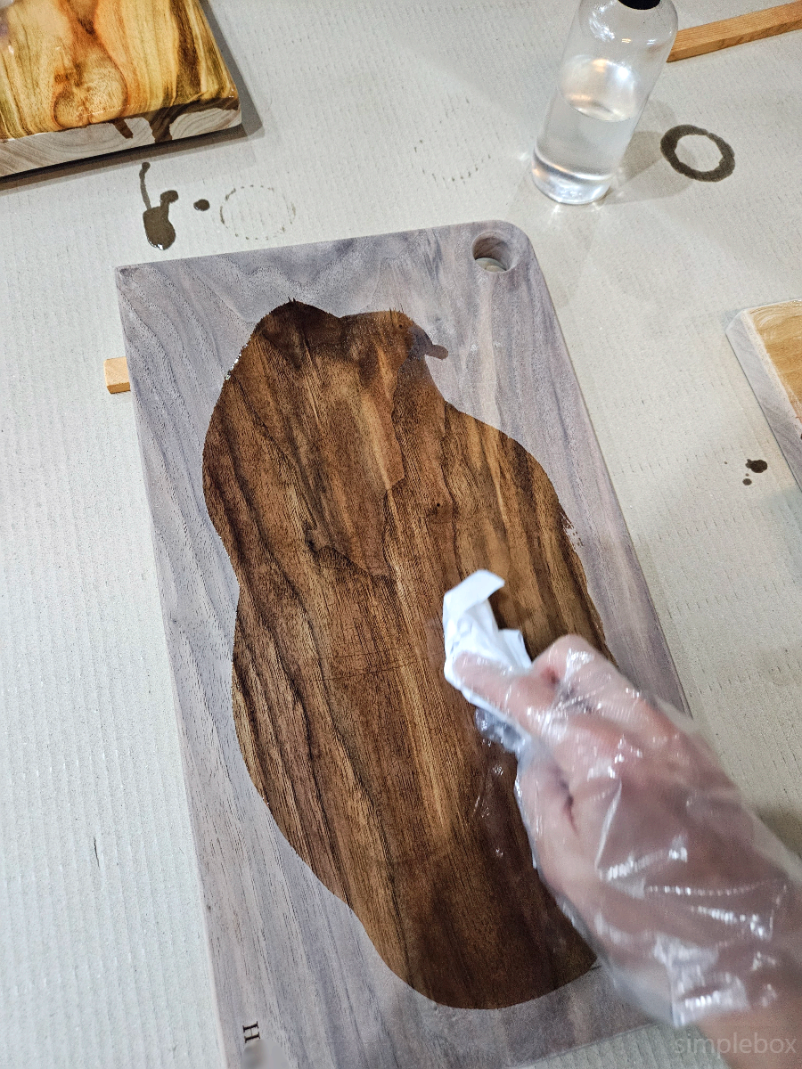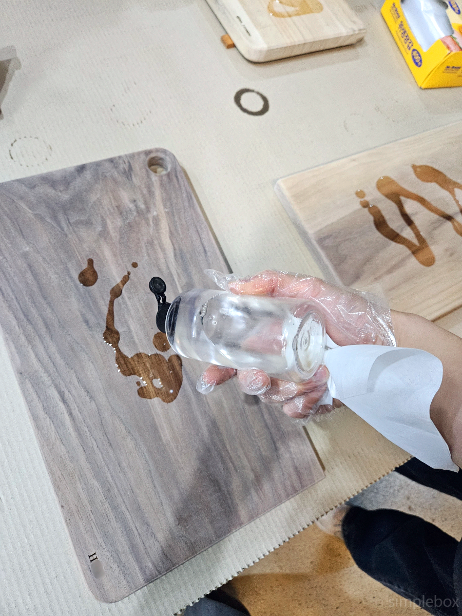 마지막 단계는 미네랄 오일을 바르는 작업이었습니다. 오일은 원목을 보호하고, 윤기를 더해주는 역할을 합니다. 고르게 오일을 바르고 나서 하루 정도 그늘에서 건조시킨 후, 도마가 완성되었습니다. 건조 후 도마는 더욱 부드럽고 윤기 나는 표면을 가지게 되었으며, 나무 본연의 색감이 잘 살아났습니다.