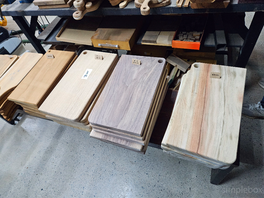 클래스의 첫 번째 단계는 다양한 도마 중에서 자신이 원하는 종류를 선택하는 것이었습니다. 선택할 수 있는 도마 종류로는 캄포나무, 월넛, 오크 등이 있었고, 각 도마는 색상과 질감, 특성이 다르기 때문에 원하는 느낌을 고려해 선택할 수 있었습니다.