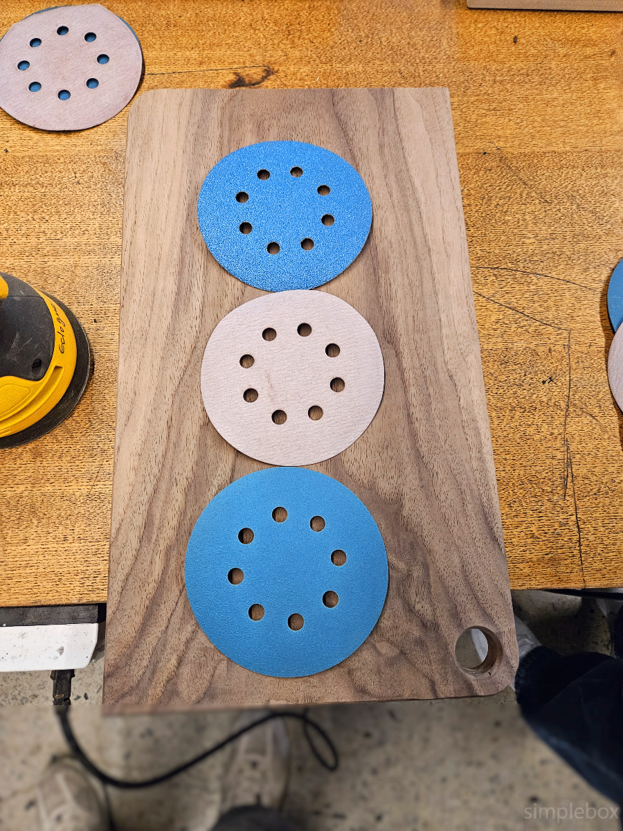 도마를 선택한 후에는 전동 샌딩기를 이용해 샌딩을 진행했습니다. 처음에는 거친 사포로 표면을 다듬고, 이후에는 중간 사포와 연한 사포로 순차적으로 작업을 했습니다. 전동 샌딩기를 사용하니 수월하게 작업을 진행할 수 있었고, 도마의 표면이 점차 부드러워지는 걸 느낄 수 있었습니다. 샌딩 후에는 에어건을 사용해 표면에 남아 있는 먼지를 깔끔하게 제거하며 마무리했습니다.
