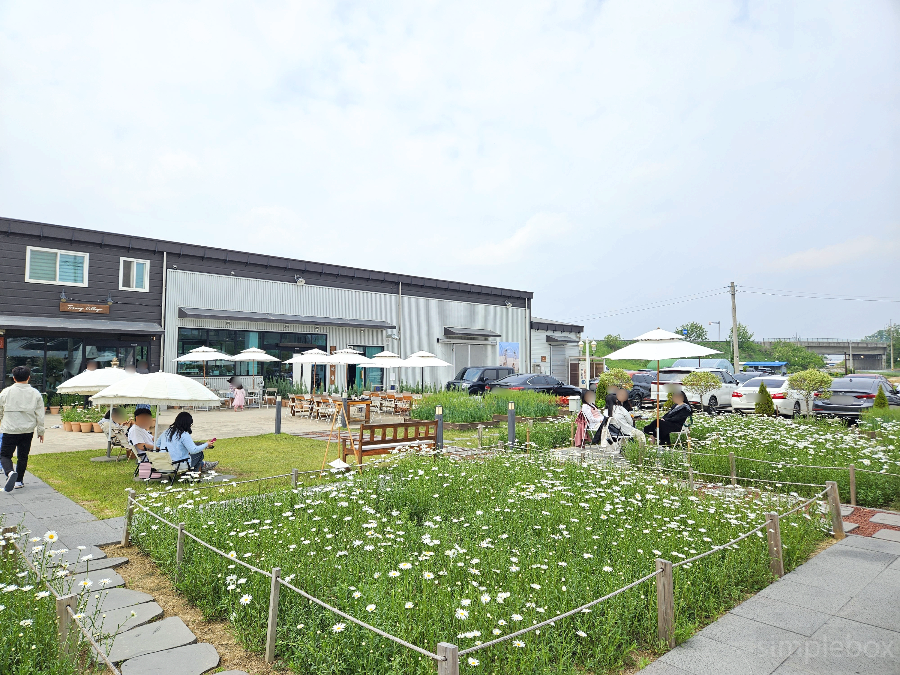 카페는 총 세 부분으로 나뉘어 있었습니다. 메인 주문 건물과 유리온실 모양의 건물 2동, 그리고 야외 정원과 오두막이 있었어요. 정원 가운데는 예쁜 데이지 꽃밭이 조성되어 있어 눈길을 끌었고, 곳곳에 포토존이 많아 사진 찍기 좋아하는 분들에게는 너무 좋은 장소였어요. 특히 오두막에 앉아 있으면 피크닉 온 듯한 기분이 들어 힐링이 되었습니다.