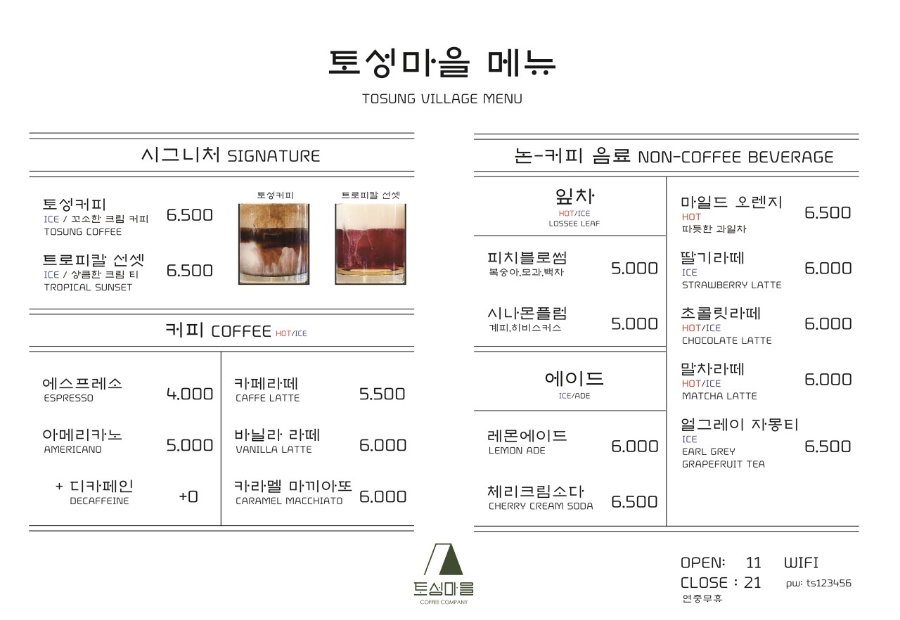| 토성커피 6,500 트로피칼 선셋 6,500 에스프레소 4,000 아메리카노 5,000 디카페인 0 카페라떼 5,500 바닐라라떼 6,000 카라멜마끼야또 6,000 |