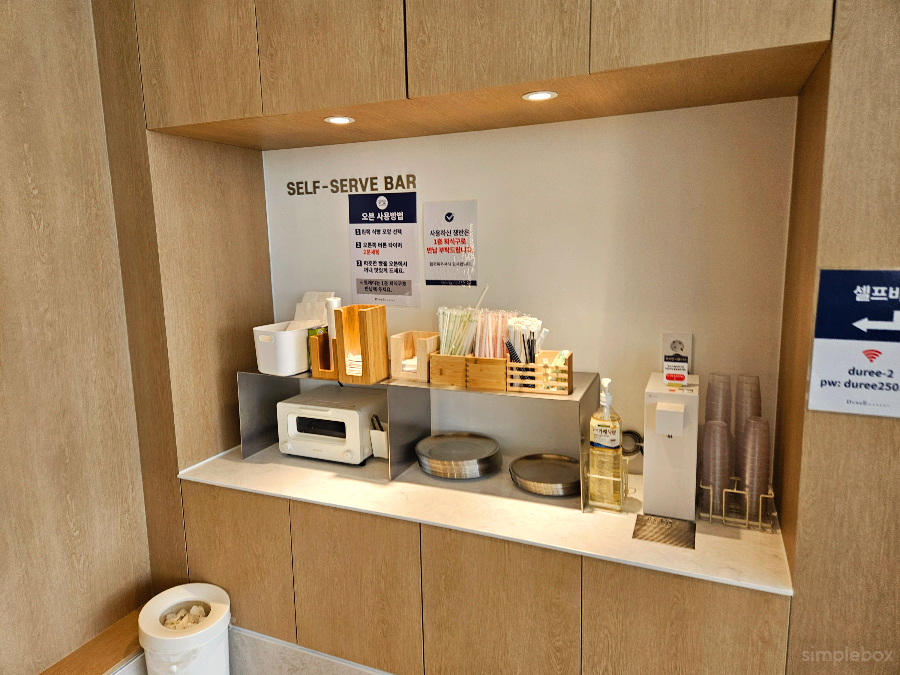직원분들이 친절해서 기분 좋았고, 셀프바도 아주 잘 정돈되어 있었어요. 정수기, 빨대, 시럽, 포장지 등 필요한 게 빠짐없이 준비되어 있어 이용하기 편했습니다.