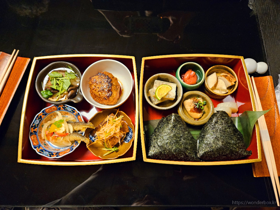 객실 내에서 제공되는 저녁과 아침 식사는 대부분 일본식 정식으로 제공되며, 제가 방문했을 당시 정갈하고 깔끔한 저녁식사가 나왔는데 제공되는 주먹밥 양이 생각보다 많아서 성인 남성도 충분한 양이었습니다.
