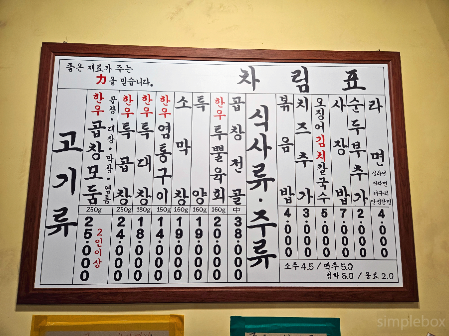 | 한우곱창모둠25,000 한우특곱창 24,000 한우특대창 18,000 한우염통구이 14,000 소막창 19,000 특양 19,000 한우투뿔육회 20,000 곱창전골 38,000 |