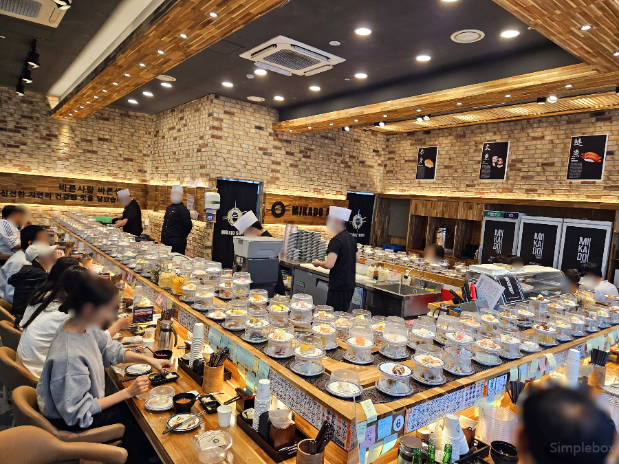 인기가 많아 기본적인 웨이팅은 발생하지만, 회전율이 빨라 오래 기다리지는 않았습니다. 혼밥하기 좋은 분위기라 실제로 1인 손님들도 많았고, 저는 둘이서 25접시를 먹었는데 다른 분들에 비해 적게 먹은편이더라구요.