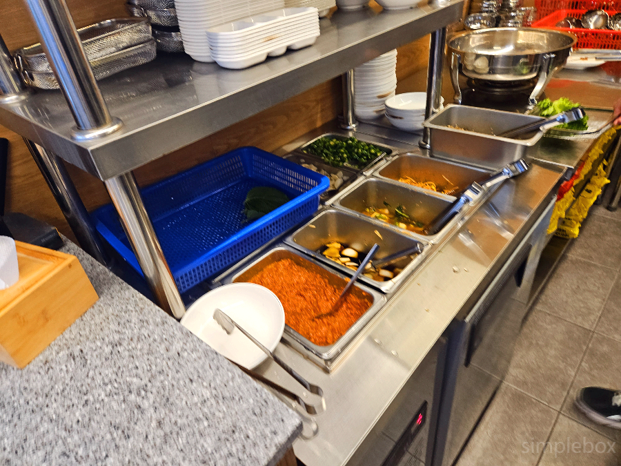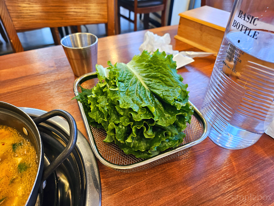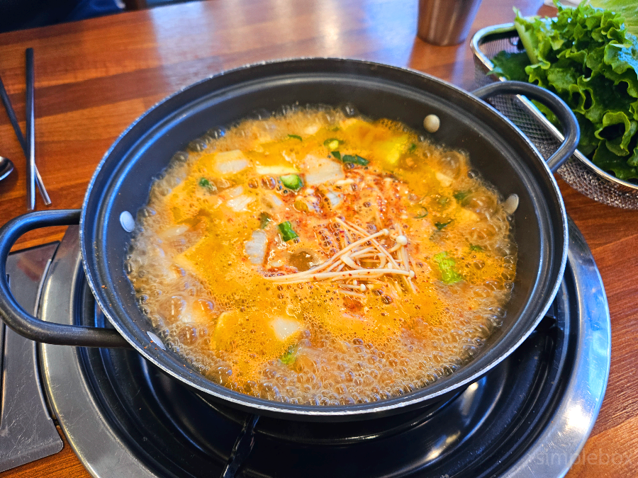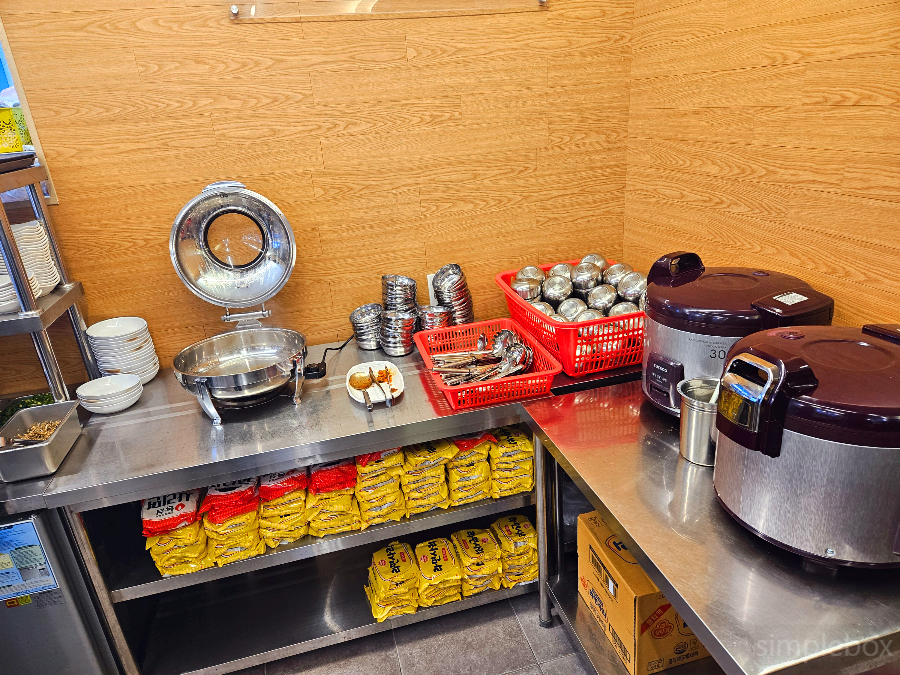 무엇보다 가장 만족스러웠던 건 셀프바였습니다. 밥, 상추 같은 쌈류, 다양한 기본 밑반찬, 그리고 무료로 제공되는 라면사리까지 준비되어 있어 원하는 만큼 자유롭게 즐길 수 있었어요. 라면사리를 된장찌개에 넣어 먹는 재미도 있어 식사의 즐거움을 더해줬습니다.