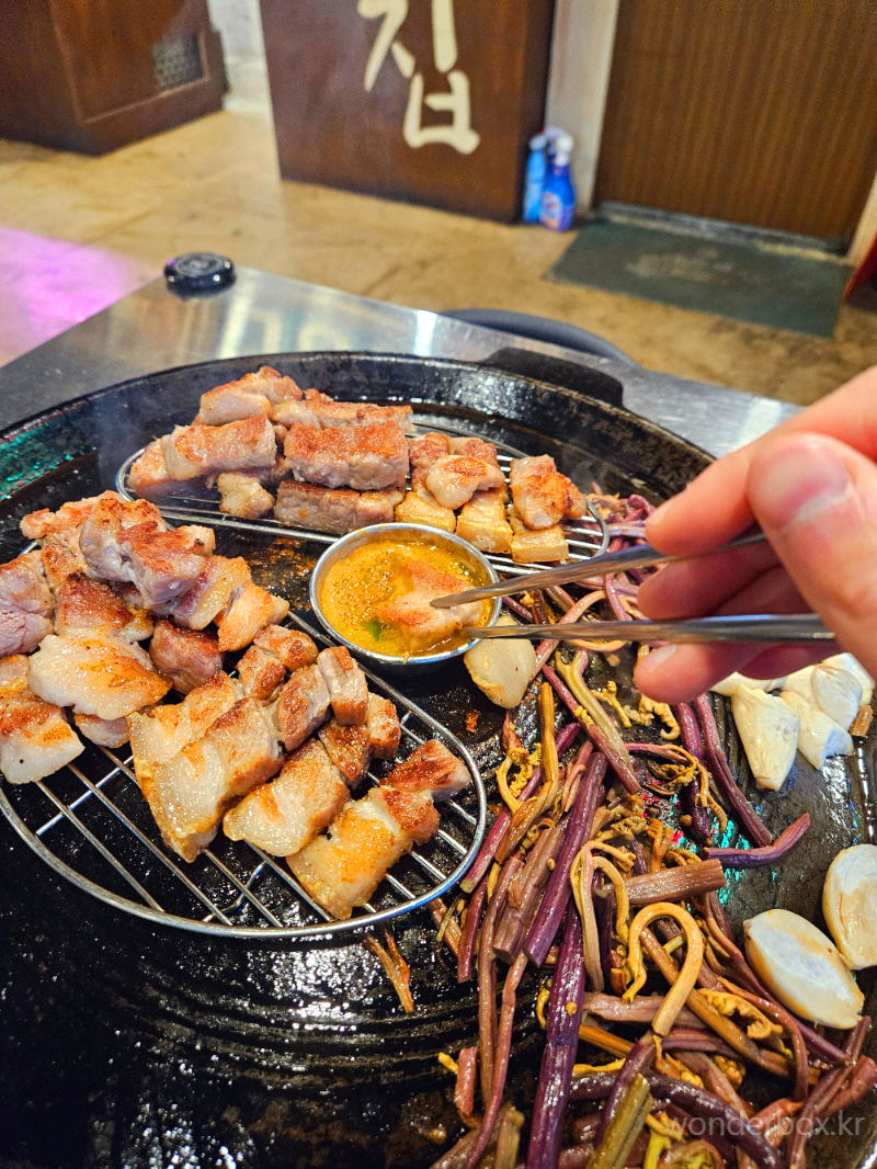 이 나물들은 고기를 구울 때 함께 솥뚜껑 위에 올려서 같이 구워 먹으면 신기하리만큼 잘 어울렸고, 솥뚜껑 위에서 구워진 나물 그 자체로도 맛있었지만, 고기와 함께 먹으면 더 풍미가 살아났어요.