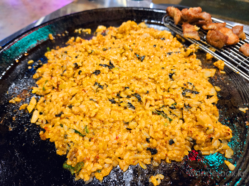고기를 먹은 후에 이 볶음밥을 먹으면 입 안을 깔끔하게 마무리할 수 있어요. 볶음밥의 고소한 맛과 치즈의 부드러움이 고기와 잘 어우러져서, 끝까지 든든하게 먹는 기분입니다.
