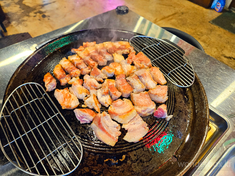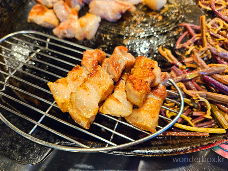 - 삼겹살: 두툼하게 썬 삼겹살은 겉은 바삭하고 속은 촉촉하게 구워져 육즙이 가득하고 고소한 맛이 특징입니다. 적당히 올라간 기름이 고기의 깊은 맛을 살려주어, 한 점씩 먹을 때마다 아주 만족스럽습니다.