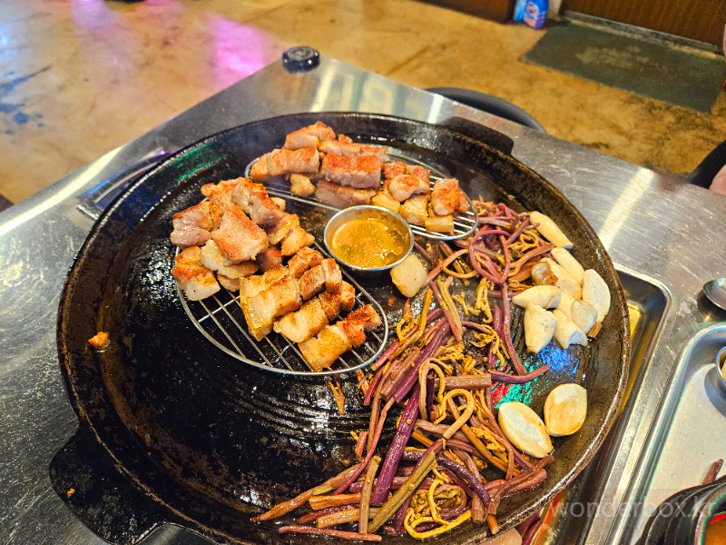 삼겹살 역시 두툼한 고기와 고소한 맛이 일품으로, 솥뚜껑에 구워내기 때문에 고기의 육즙을 빠짐없이 즐길 수 있어요.
