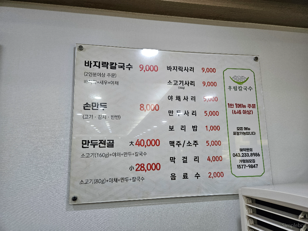 | 바지락칼국수 9,000 손만두 8,000(고기/김치/반반) 만두전골 소 28,000, 대 40,000 |