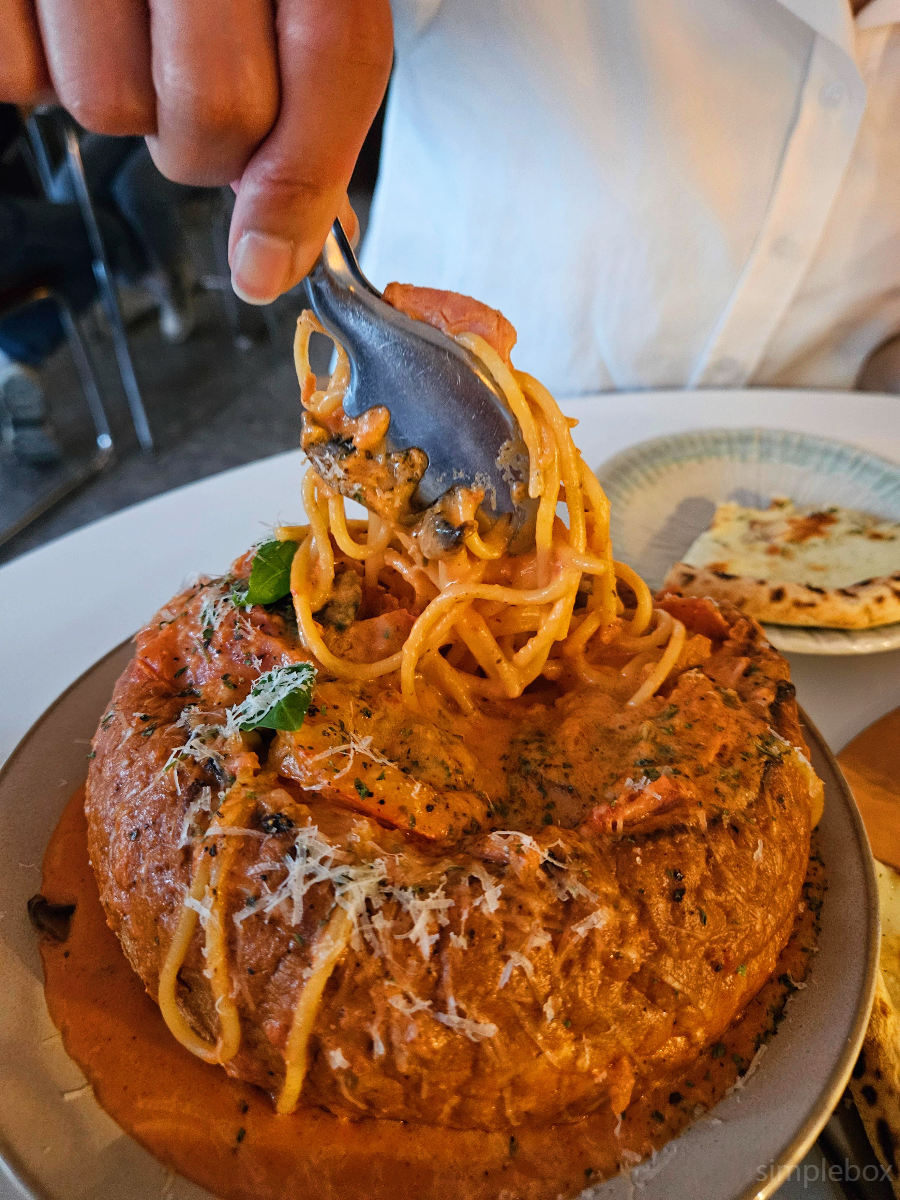 그리고 이날의 하이라이트였던 베이컨새우로제빠네. 바삭하게 구워낸 통통한 빵 안에 진한 로제소스가 가득 담겨 있었고, 베이컨과 새우도 큼직하게 들어 있어 씹는 맛도 좋았어요. 빠네 안의 소스는 빵 속까지 촉촉하게 스며들어 있었고, 남은 소스까지 포크로 긁어먹게 만드는 매력적인 메뉴였어요.