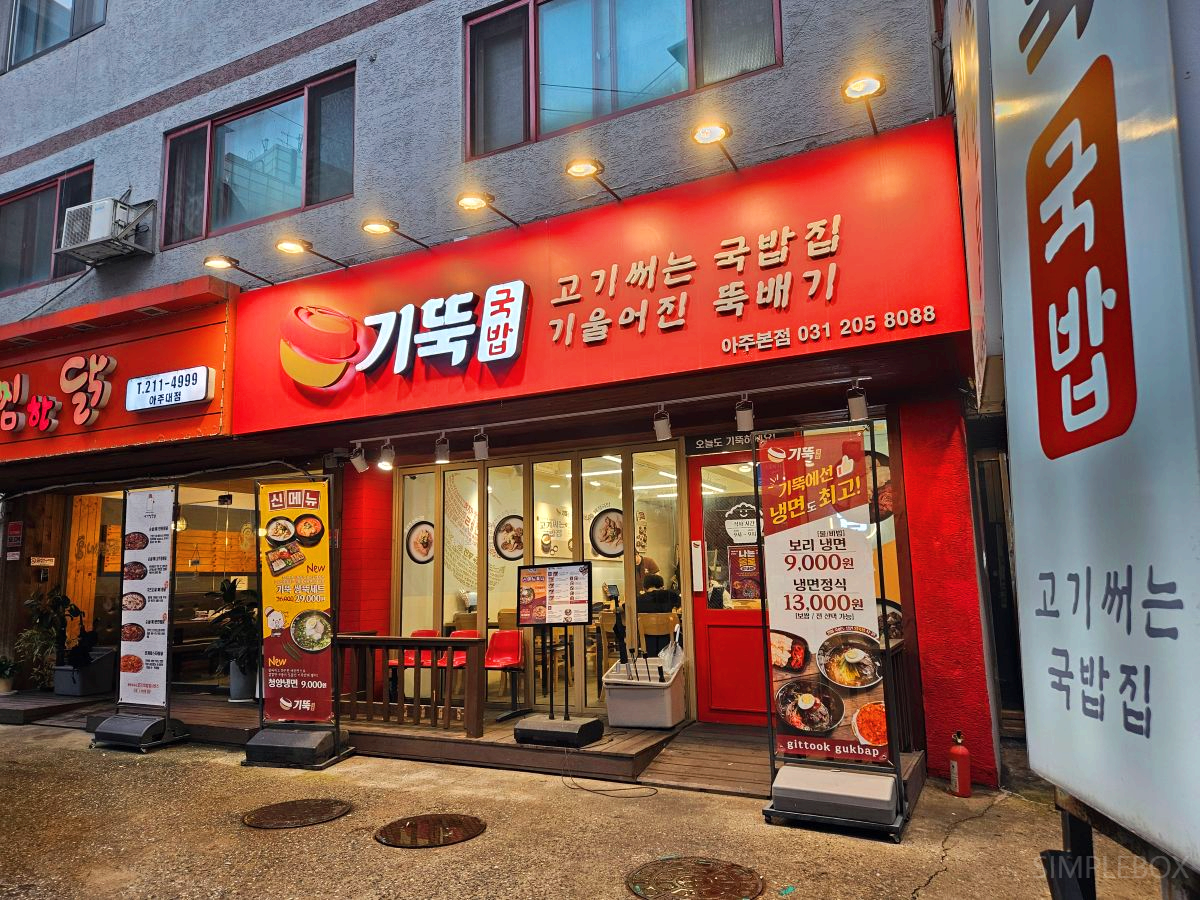 기뚝국밥 아주본점은 수원시 팔달구 아주대학교 인근에 위치해 있어 접근이 편리합니다. 특히 스포츠아일랜드 수영장과 가까워 운동 후 들르기에 딱 좋았습니다. 유동 인구가 많은 지역이라 평일 점심에도 손님이 꾸준히 있었어요.