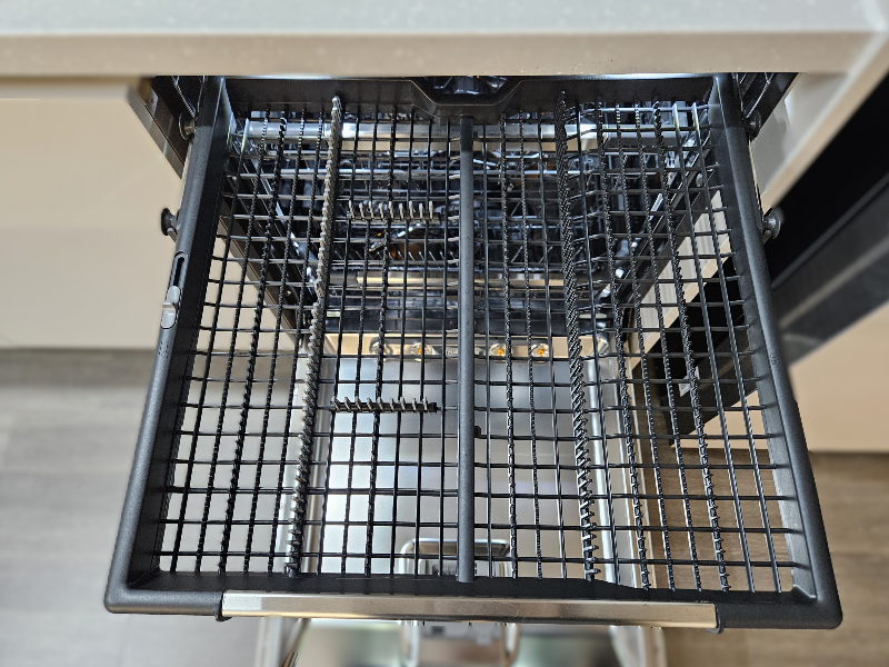 식기 넣기: 식기세척기의 최상단, 상단, 하단 산반에 식기를 정리해 넣습니다. 그릇은 세워서 고르게 배치하고, 큰 식기는 하단에 넣어야 효율적으로 세척할 수 있습니다. 이때 주의할 점은 상단 선반의 프로펠러와 간섭이 일어나기 않도록 주의해야 합니다.