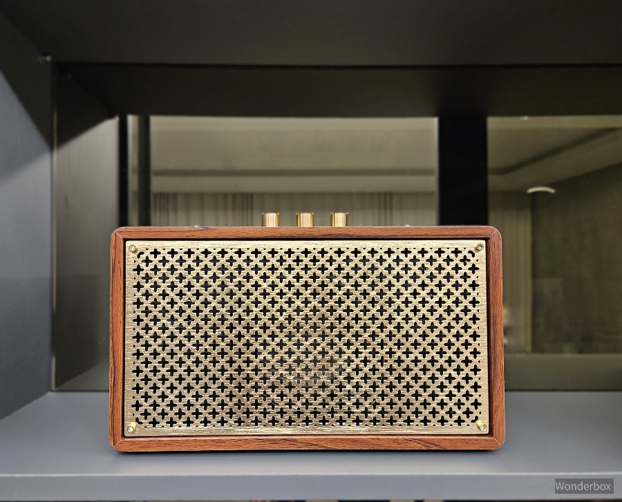 BZ-JB5606의 가장 큰 장점 중 하나는 바로 디자인입니다. 제품의 외관은 클래식하면서도 세련된 느낌을 주는데, 이는 우드 느낌의 패널과 메탈릭한 스피커 그릴이 잘 어우러져 빈티지한 감성을 자아내기 때문입니다. 원목 재질을 활용한 디자인은 아날로그적인 느낌을 주면서도 현대적인 감각을 잃지 않아서, 집안 어디든 인테리어에 잘 어울립니다. 특히 알루미늄 상단 컨트롤러는 고급스러운 느낌을 더해 줍니다.